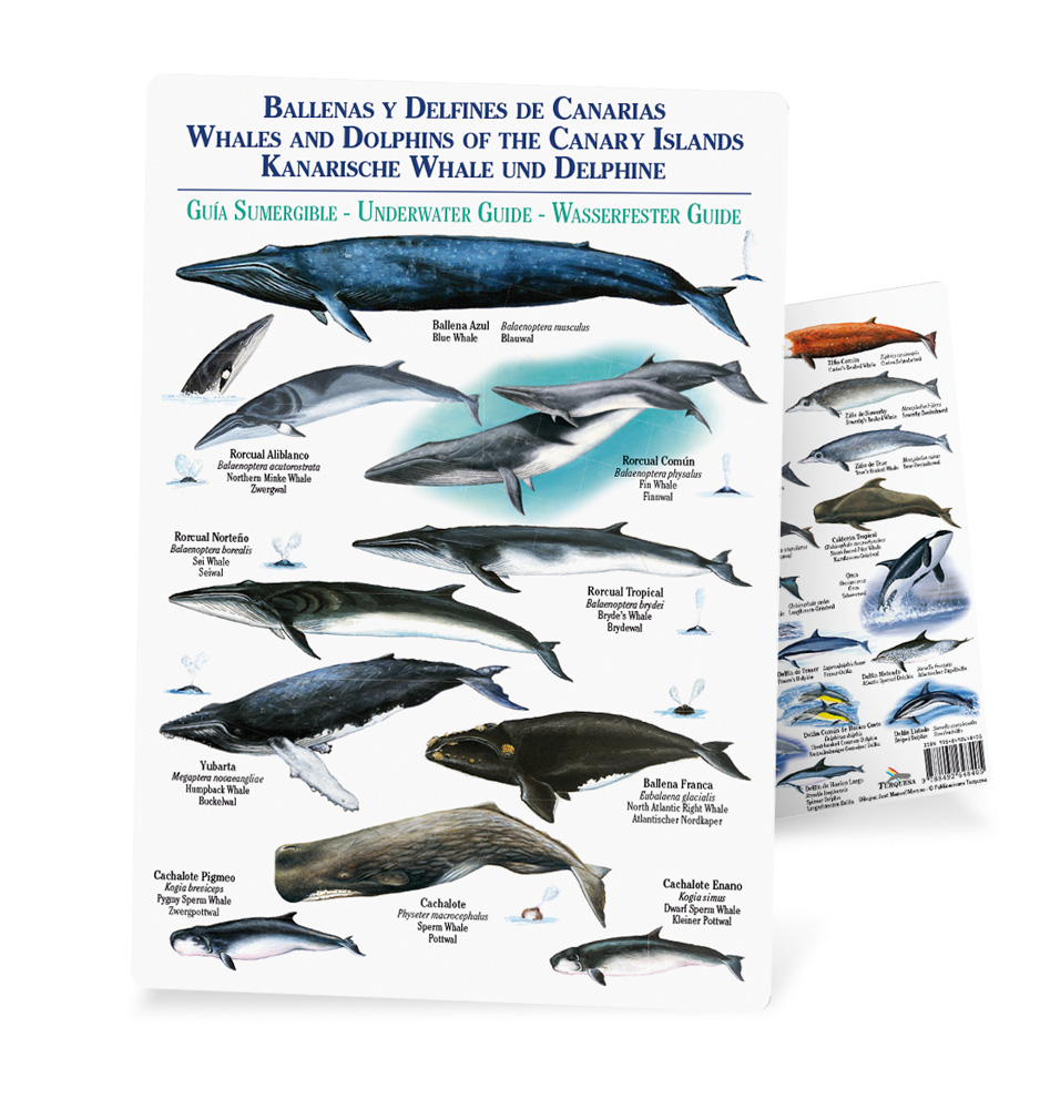 Guía de Naturaleza de Canarias para la identificación de ballenas y delfines. Lámina encapsulada sumergible. 28 ilustraciones científicas para la identificación de los cetáceos que surcan las aguas canarias. Del biólogo marino e ilustrador científico de fauna canaria José Manuel Moreno. Formato: 15 x 21 cm.
