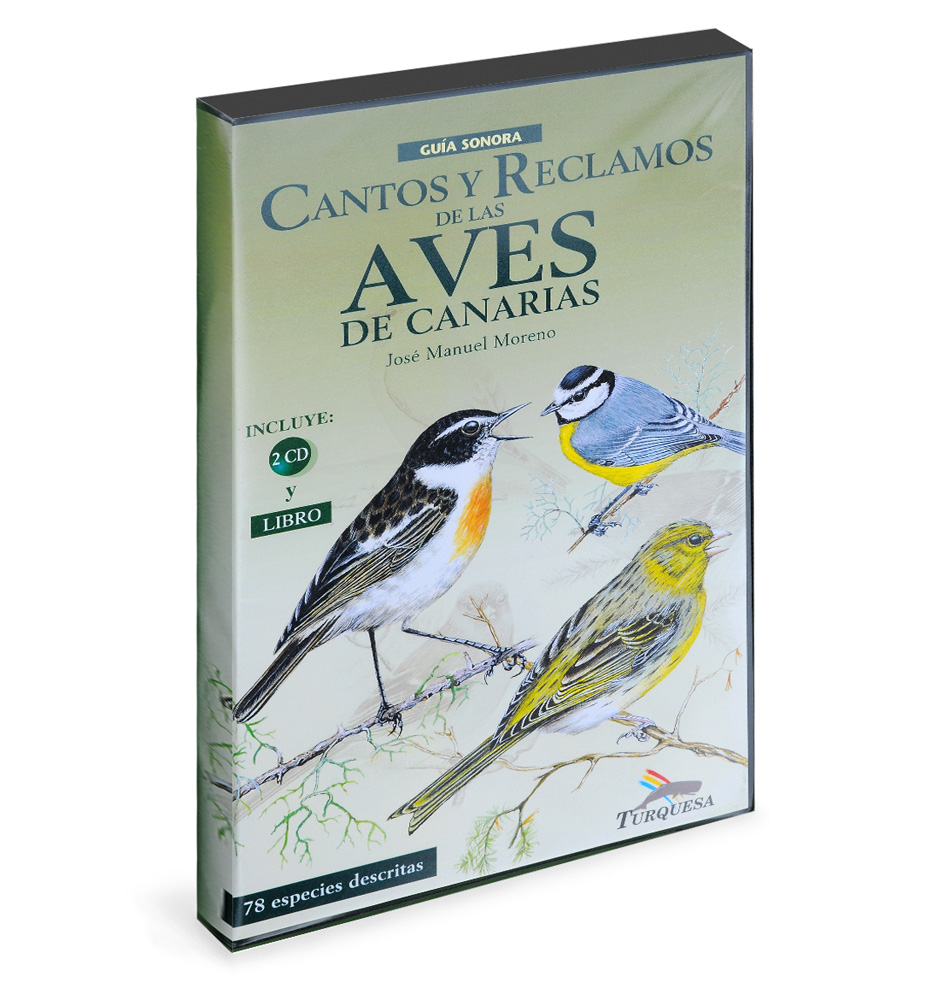 Esta obra es la primera guía sonora de las aves de Canarias. Incluye los cantos y reclamos de casi todas las especies y subespecies nidificantes, incluso las más raras, como el Paíño Pechialbo, Paíño de Madeira, Halcón de Berbería, Hubara, Corredor, Pinzón Azul de Gran Canaria, Camachuelo trompetero, etc. Se compone de 2 CD y un libro acompañante en un magnífico estuche, con amplia información sobre la descripción de los sonidos, lugares para oír a cada especie, estatus, distribución, sonograma y dibujos a color. Una guía indispensable para reconocer a las aves de Canarias por sus cantos. Esta guía es el resultado de la experiencia y más de 5 años de grabación de sonidos y trabajo de campo del Ornitólogo canario José Manuel Moreno. En esta obra destacan, además de las increíbles y exclusivas grabaciones de cantos de aves, por su rigor y pulcritud de las descripciones e ilustraciones científicas de las especies y subespecies.