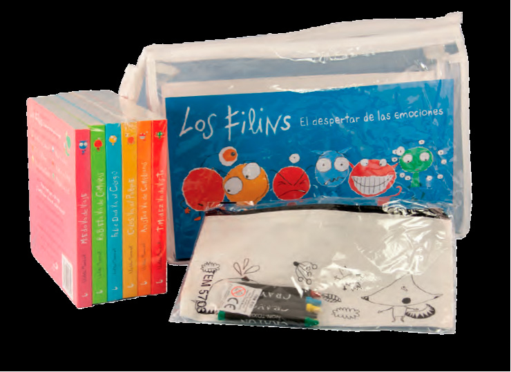 Un original pack presentado en bolsa de plástico transparente con cremallera de cierre que incluye seis libros de cartón plastificado, un práctico estuche de material pintable con motivos predibujados para colorear y un paquete de ceras de colores. En cada uno de los seis libritos se tratan temas clave para el mundo emocional de los niños que a través de unos simpáticos personales llamados «filins» aprenderán a lidiar con temas como la amistad, las rabietas, los celos, la felicidad, la timidez y el miedo.