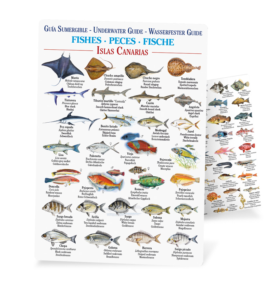 Guía de Naturaleza de Canarias para la identificación de peces. Lámina encapsulada sumergible. 63 ilustraciones científicas para la identificación de los peces que habitan las aguas canarias. Del biólogo marino e ilustrador científico de fauna canaria José Manuel Moreno. Formato: 15 x 21 cm.